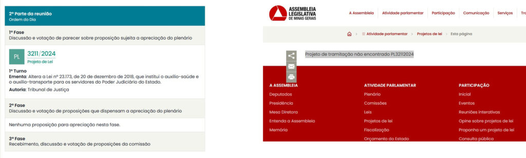 A inclusão, na pauta de uma comissão da Assembleia Legislativa de Minas Gerais (ALMG), de um projeto de lei que sequer tem o inteiro teor disponível no site da Casa chamou a atenção de interlocutores nesta terça-feira (8). O texto, que estipula novas regras para o pagamento de auxílio-saúde e auxílio-transporte aos servidores do Judiciário estadual, foi recebido em plenário hoje e já passou a compor a pauta de votação da sessão desta quarta-feira (9) da Comissão de Fiscalização Financeira e Orçamentária (FFO).