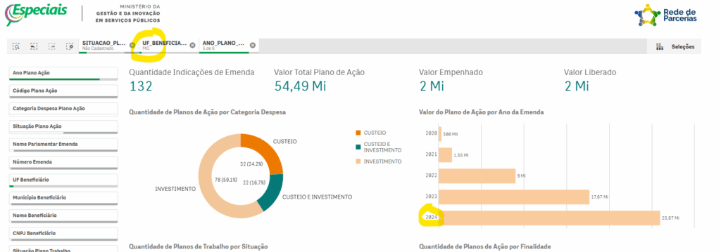 Um painel do Ministério da Gestão mostra 167 emendas parlamentares destinadas a Minas Gerais, somando R$ 68,4 milhões, sem planos de trabalho cadastrados.