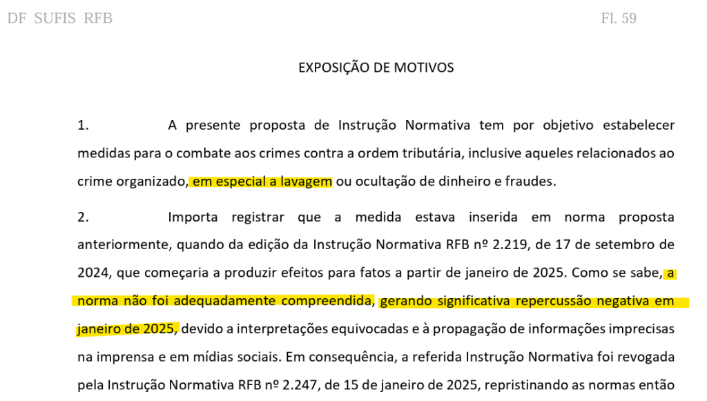 “Permanece, contudo, a necessidade de coleta das informações financeiras previstas na Instrução Normativa RFB nº 2.219, de 17 de setembro de 2024”, diz a exposição de motivos, citando a norma revogada após o vídeo de Nikolas.