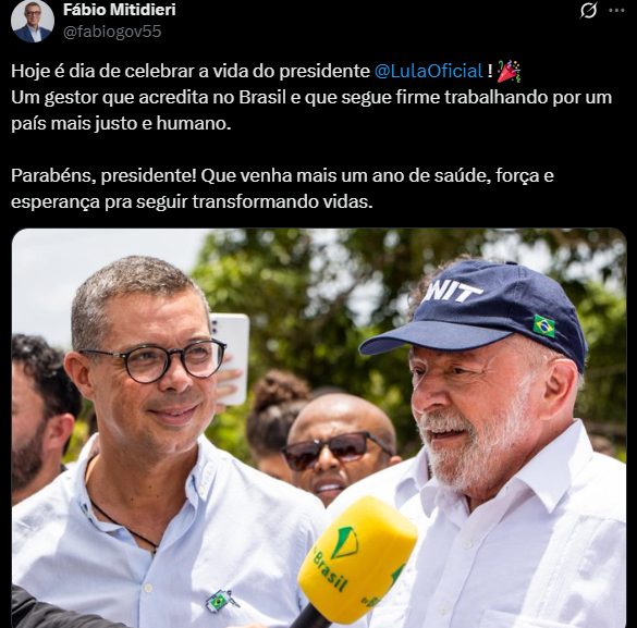 Horas antes de participar do ato de embarque de Simões ao PSD, em Belo Horizonte, Mitidieri publicou no X, anteriormente chamado de Twitter, um texto elogioso a Lula, que completou 80 anos de idade nesta segunda-feira. O post também aparece no Instagram do sergipano.