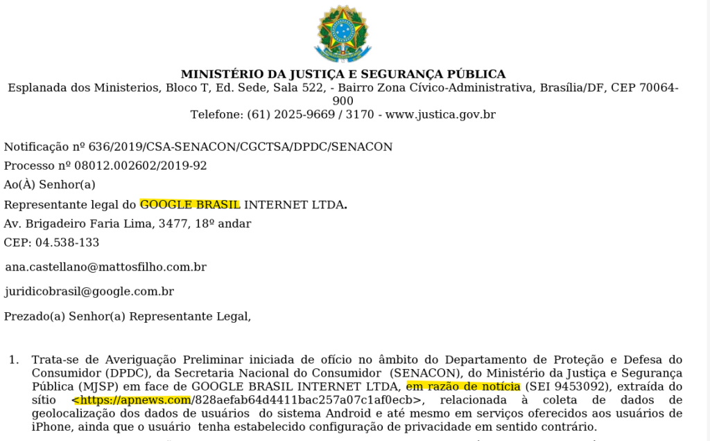 A partir daí começa uma correspondência com os advogados brasileiros do Google, que enfrentam os questionamentos da Senacon.