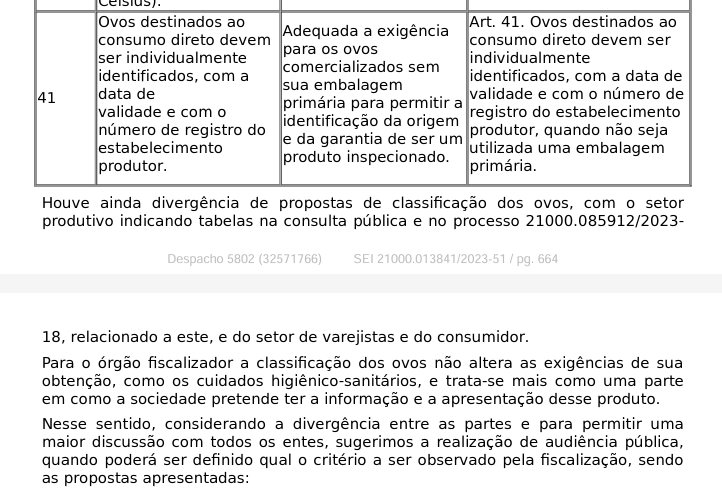 Uma menção à norma prevendo que “ovos destinados ao consumo direto devem ser individualmente identificados” aparece pela primeira vez em relatório da consulta pública de 2021, quando o processo regulatório começou. Portanto, o governo teve a oportunidade de discutir essa proposta na audiência pública de março de 2024, mas não o fez.