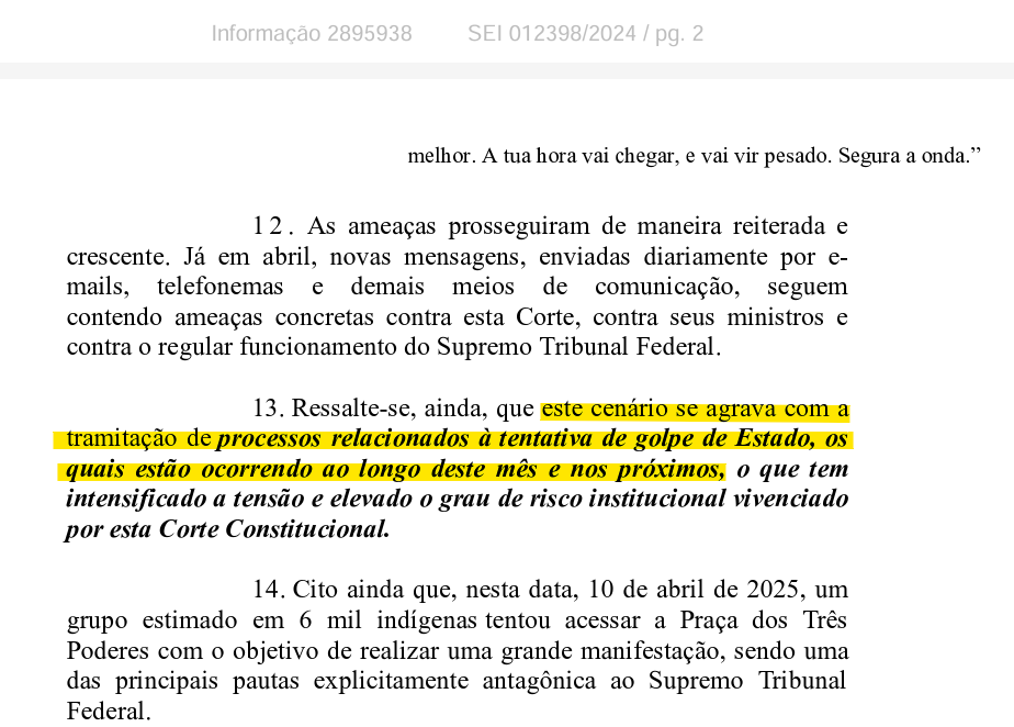 Seabra concluiu: “o evento ocorrido em 13 de novembro de 2024 não constitui fato isolado, mas sim marco de uma escalada crescente e ininterrupta de ameaças graves, que vêm se materializando em palavras, atos e condutas concretas, direcionadas à destruição da autoridade, da integridade física e da estabilidade desta Instituição”.
