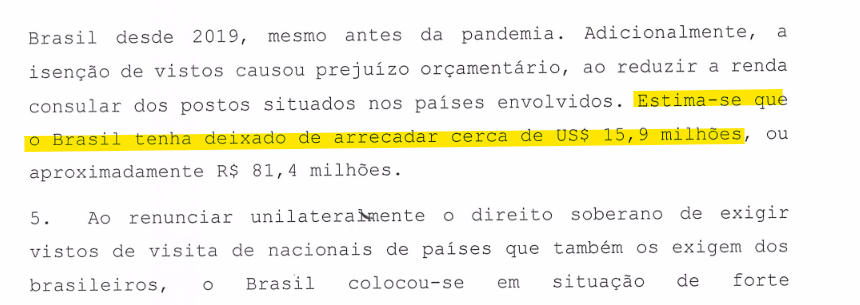 Em exposição de motivos apresentada pelo Itamaraty e entregue a Lula em 2023, o ministério estima que o Brasil tenha deixado de arrecadar “cerca de US$ 15,9 milhões” com a isenção de vistos, determinada por decreto em 2019, pelo governo Bolsonaro.