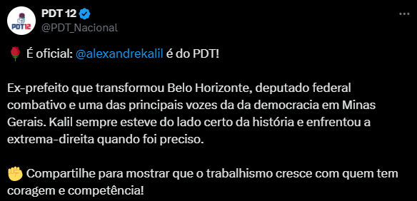 “Ex-prefeito que transformou Belo Horizonte, deputado federal combativo e uma das principais vozes da democracia em Minas Gerais. Kalil sempre esteve do lado certo da história e enfrentou a extrema-direita quando foi preciso”, diz um trecho do texto publicado pelo PDT.