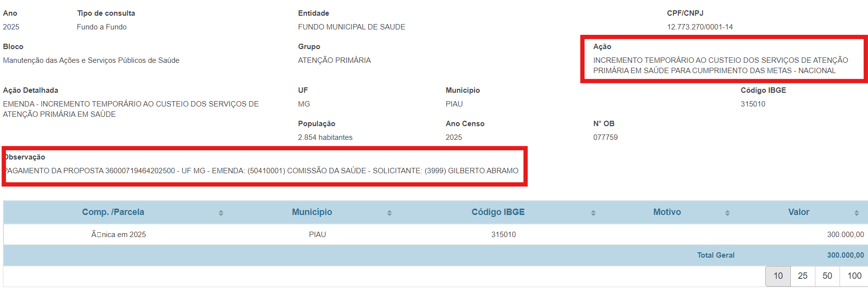 Dados do Fundo Nacional de Saúde (FNS) detalham a emenda destinada pela Comissão de Saúde. O campo “observação” traz Gilberto Abramo como “solicitante” do repasse. Os registros sinalizam, ainda, que o dispositivo atende ao “incremento temporário ao custeio dos serviços de Atenção Primária em Saúde para cumprimento de metas”. O CNPJ atendido é do Fundo Municipal de Saúde de Piau, o que caracteriza uma transferência fundo a fundo, como prevê a Lei Complementar 210/2024, que regula os modelos de execução de indicações parlamentares.