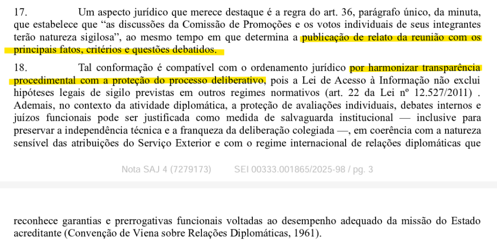 Em um trecho, a Secretaria Especia para Assuntos Jurídicos da Casa Civil destaca: “Um aspecto jurídico que merece destaque é a regra do art. 36, parágrafo único, da minuta, que estabelece que “as discussões da Comissão de Promoções e os votos individuais de seus integrantes terão natureza sigilosa”, ao mesmo tempo em que determina a publicação de relato da reunião com os principais fatos, critérios e questões debatidos. Tal conformação é compatível com o ordenamento jurídico por harmonizar transparência procedimental com a proteção do processo deliberativo, pois a Lei de Acesso à Informação não exclui hipóteses legais de sigilo previstas em outros regimes normativos”.