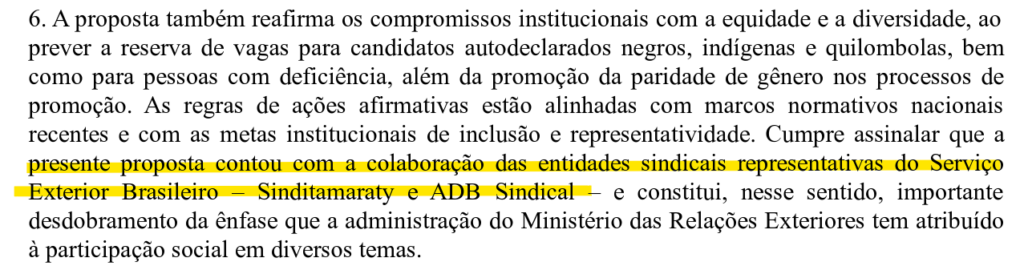 Documentos obtidos pela reportagem via Lei de Acesso à Informação mostram que a Associação e Sindicato dos Diplomatas Brasileiros (ABD) e o Sinditamaraty (que inclui outros servidores do ministério além de diplomatas) participaram da elaboração do novo texto.