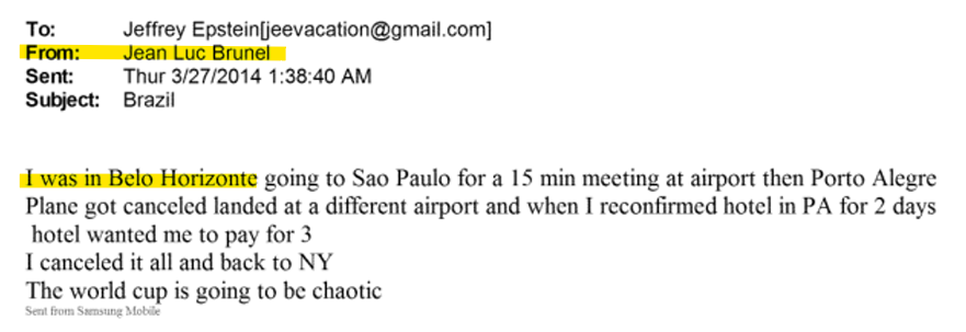 Em e-mail enviado em 27 de março a Epstein, Brunel contou: