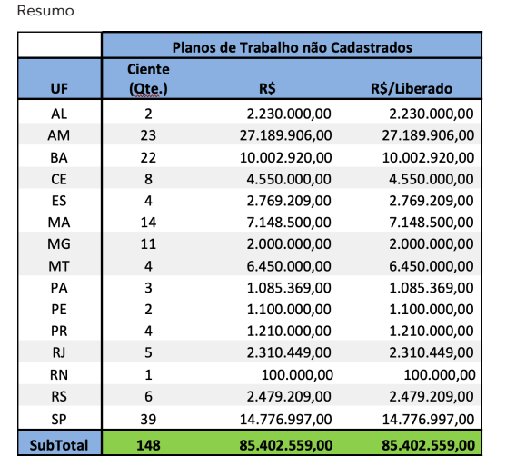 A nota técnica, compartilhada pelo TCU com O Fator, inclui uma tabela com 148 emendas parlamentares, sendo 11 em Minas Gerais.