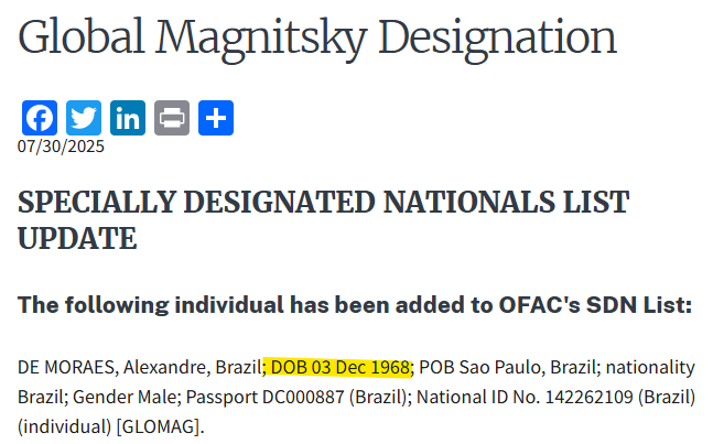 A publicação errou a data de nascimento de Moraes. Ele famosamente nasceu em 13 de dezembro de 1968, o dia do AI-5, e não no dia 3.