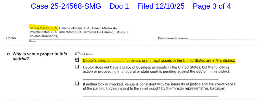 O formulário da petição para o reconhecimento foi assinado na segunda-feira passada (8) por Eduardo Felix Bianchini, da EFB Regimes Especiais de Empresas, nomeado pelo Banco Central como liquidante do Master. Ele é representado nos Estados Unidos pelo escritório Sequor Law.